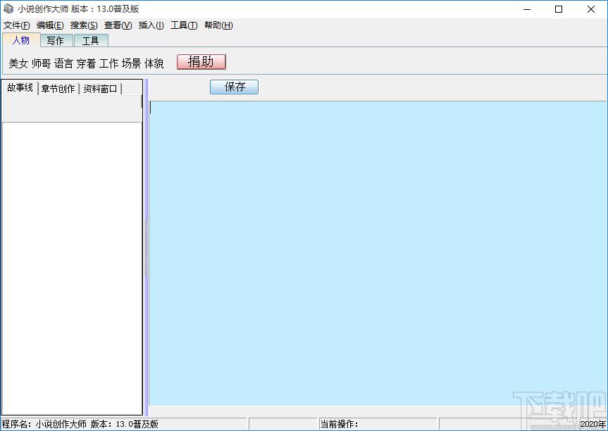 2、双击软件进入小说软件创建页面,该页面可以点击文件进行小说新建,也可点击编辑或者人物下方了解写作素材